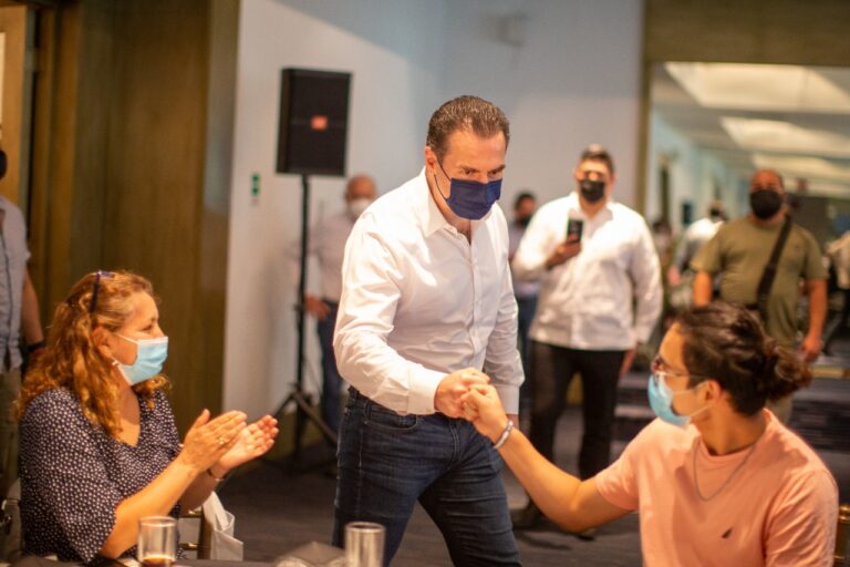 En reunión con deportistas de diversas disciplinas, el candidato de la coalición PRI-PRD a la gubernatura del estado, Adrián de...